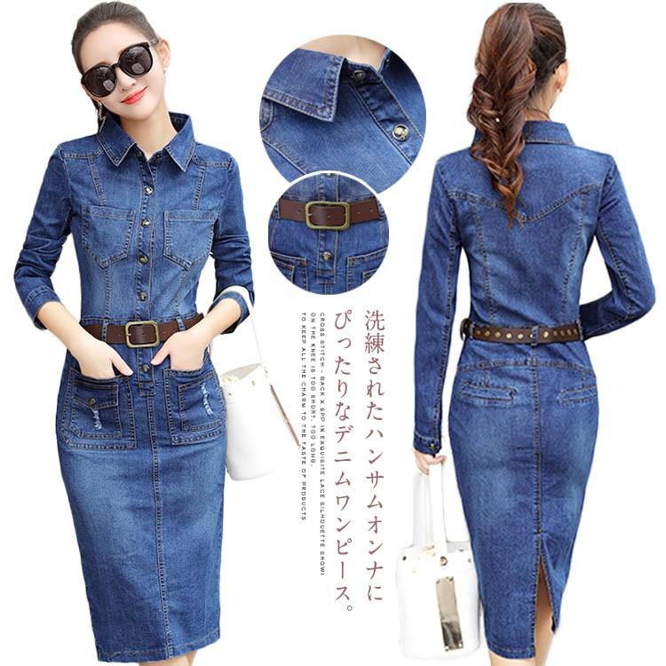 楽天市場 デニムワンピース タイトワンピース シャツワンピース ベルト付き デニムマーメイドワンピース レディース ワンピース ミモレ ロング 長袖 タイト 春秋冬 大人 上品 きれいめ エレガント Selecting